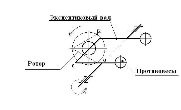 Ротор, куда бы не поворачивался на оси "с", и где бы не находилась точка "к", в рамках очерченной окружности,  полностью уравновешен относительно данной оси,  в силу своей симметричности. А ось "с" относительно оси "о" уравновешивается двумя противовесами.