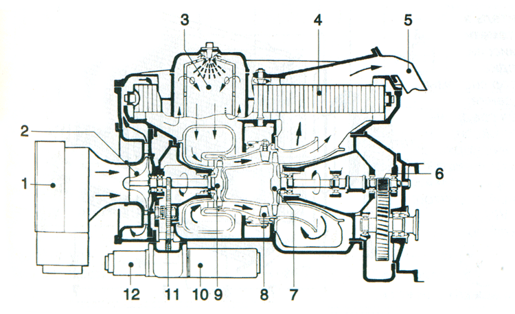 Схема работы газовой турбины: 1. Фильтр и глушитель; 2. Радиальный компрессор; 3. Камера сгорания; 4. Теплообменник; 5. Выпускное окно; 6. Шестеренчатый редуктор;7. Тяговая турбина; 8. Регулируемые направляющие лопатки турбины; 9. Компрессорная турбина; 10. Пусковое устройство (стартер); 11. Вспомогательное оборудование привода; 12. Масляный насос в системе привода.