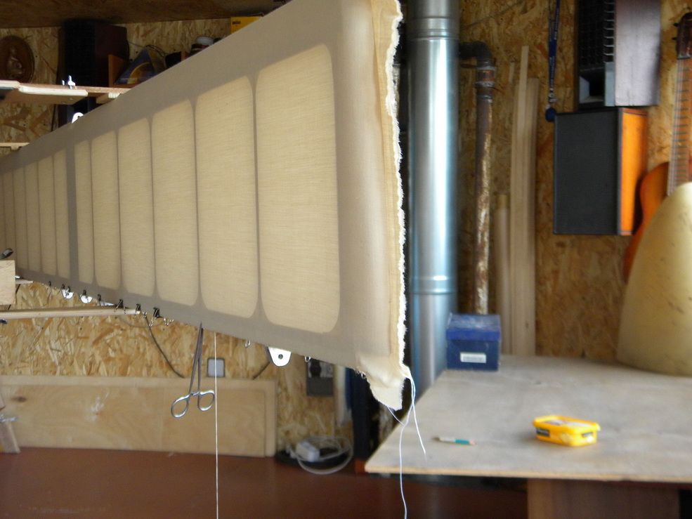Пришил вчера полностью всю сторону, и половину второй. Сегодня закончу и начну приклеивать ткань. Натяжение ткани отменное. Посмотрю сколько на этот раз слоёв придётся положить. На рулях три слоя. Чем мне понравилась такая технология, это то что не нужно дырявить лонжерон гвоздями и не надо потом их выковыривать. Нитки останутся на месте.