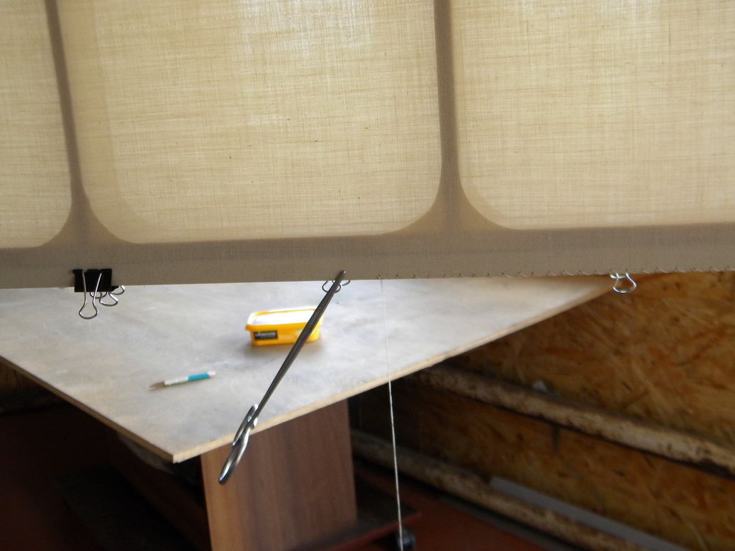 Прошил, и снова натянул ткань намотав на кусочки реечки и закрепив зажимами. Разметил второй шов по месту с учетом натяжения и прошив на машинке натянул на стаб.  Получилось хорошо. Прорезал под второй кронштейн подкоса и натянул ткань на пластмассовые уголки, закрепляя её зажимами. Начал пришивать.
