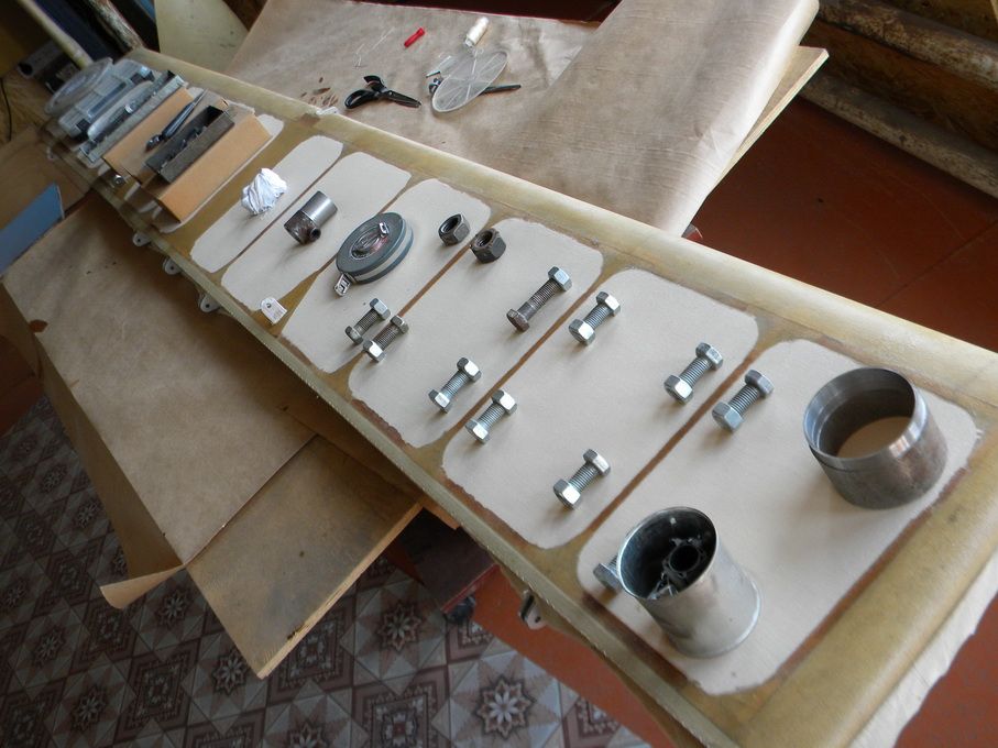 Поздно спохватился. Натяжение ткани получилось такое, что проявились огрехи изготовления. Косынки выступают над плоскостью и поэтому ткань не касалась нервюр. И как мне тут писали, что можно было просто на эмалит приклеить. Не приклеилось бы ничего просто так. Надо было напилить тоненьких реечек и подклеить на нервюрки и вывести плоскость.  Это уже мой косяк. Но снявши голову, по волосам не плачут. Пришлось пригружать ячейки, и довольно значительно, чтобы ткань легла на нервюры. Сначала думал положу по гаечке и придавит. Нифига, пришлось по 4 болта с гайками. Кое где и по тяжелее.  Сегодня доклеил вторую сторону