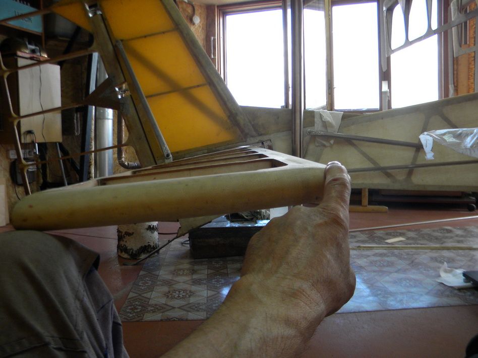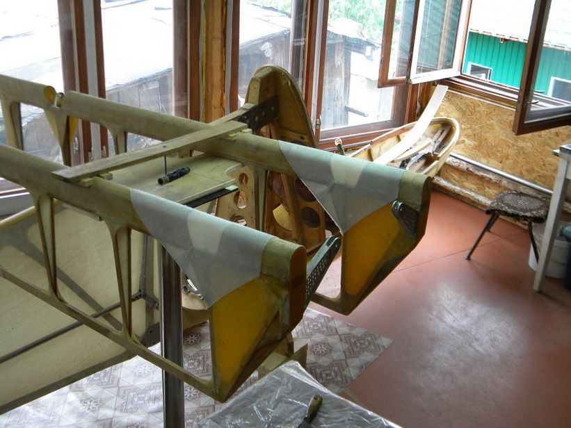 Ну вот начался новый цикл работ по планеру. С чем себя и поздравляю. Запланированная на прошлое лето обтяжка оперения отодвинулась по многим причинам, теперь пришли тёплые денёчки и можно заняться клейкой и обтяжкой.