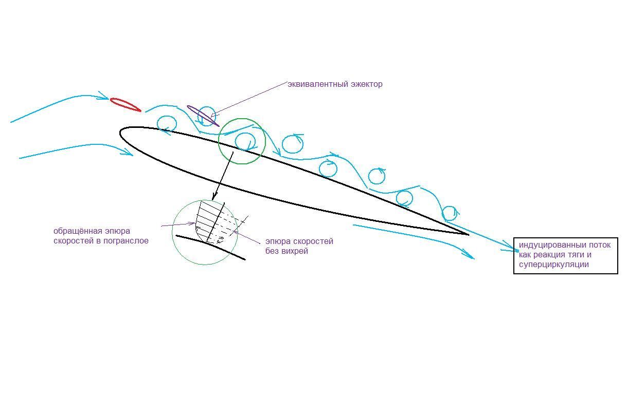 3) Ваше видение процесса,отличается от Болдыревского,но не факт,что он во всём прав. Имеющиеся снимки дымовых спектров обтекания не дают ясной картины.Хотя Ваш вариант объяснят тягу,возникающую на основном крыле,но не объясняет подъёмной силы,возникающей на месте. Более того,обтекание крыла по вашей схеме уменьшает её в движении.А по опытам,она естесственно растёт.