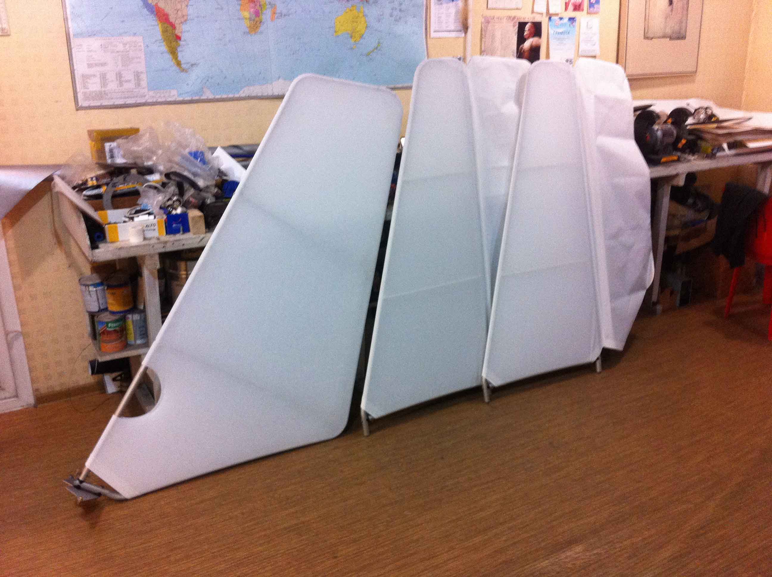 Рули высоты собраны, ткань натянута как мембрана на барабане. Ни одной шнуровки, ни одного клееного шва. Только лазерный раскрой ткани, точнейший пошив, и технология сборки.