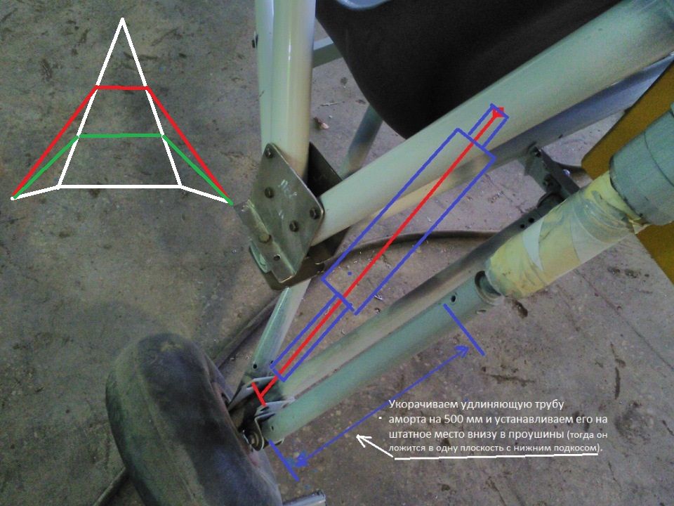Да, только не надо укорачивать трубу аморта на 500 мм. На фото ниже, "красный" вариант, лучше "зелёного".Вот так хочу расправиться с амортами , всё проходит, а угол между амортом и трубой кабины ещё уменьшается, что есть гут