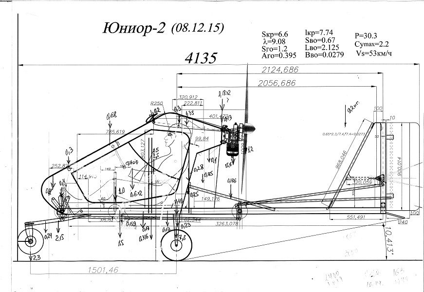 размеры сейчас посмотрю пояснюю действительно эскизы могут не все отражать могут быть вопросы смело задавайте завтра отвечу а что касаетя крыла там только табл на носик нет но на этот вопрос мы легко ответим ......а поднимать искуственна забытый самолет нет необходимости потому что мы не преследуем цель рекламы....если комуто чтото спросить пожалуйста подсказапть пишите на этой стр юниор..я сам жду результатов освоения пилотом нашего самолета юниор... вот эта инф действительно должна быть размещена так как летающих сам с сух весом до 100 кг и спроектированного по нормам чтото я не припомню поэтому мнение тех кто тна них летает интерсно....а здесь пилот который когдато учился на сам. як 18 помоему ... другой класс тип ..вес ..иннерционные характеристики.... вот если у него все будет хорошо и мы об этом узнаем не от меня а от него тогда да можно смелее идти дальше. заминка из за дождей на кубани.