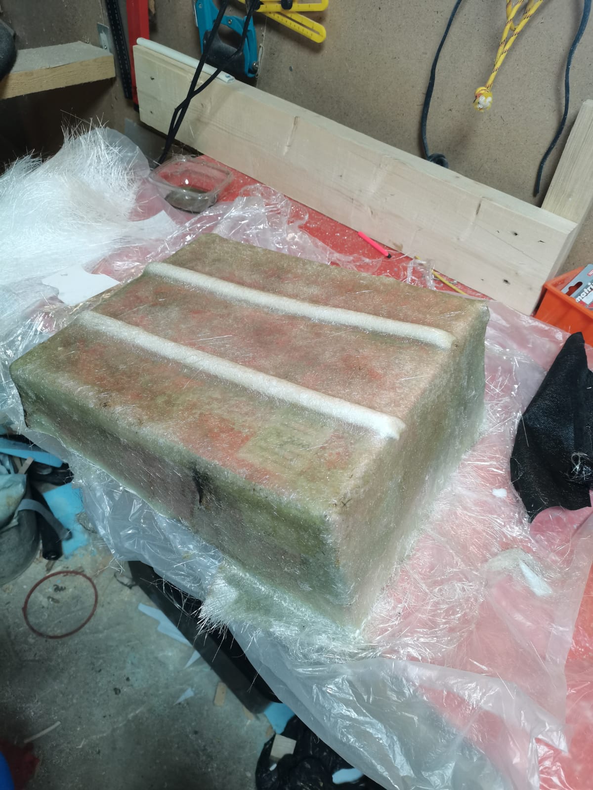 Померял, нарисовал и сделал шаблончик из картона своей полки. Примерил, подравнчл, понравилось. От своей лени не стал делать шаблон из дерева, а просто усилил картонный шаблон, обмотал плёнкой и закатал стеклоровингом 500г./м² с полиэфирной смолой в один слой.