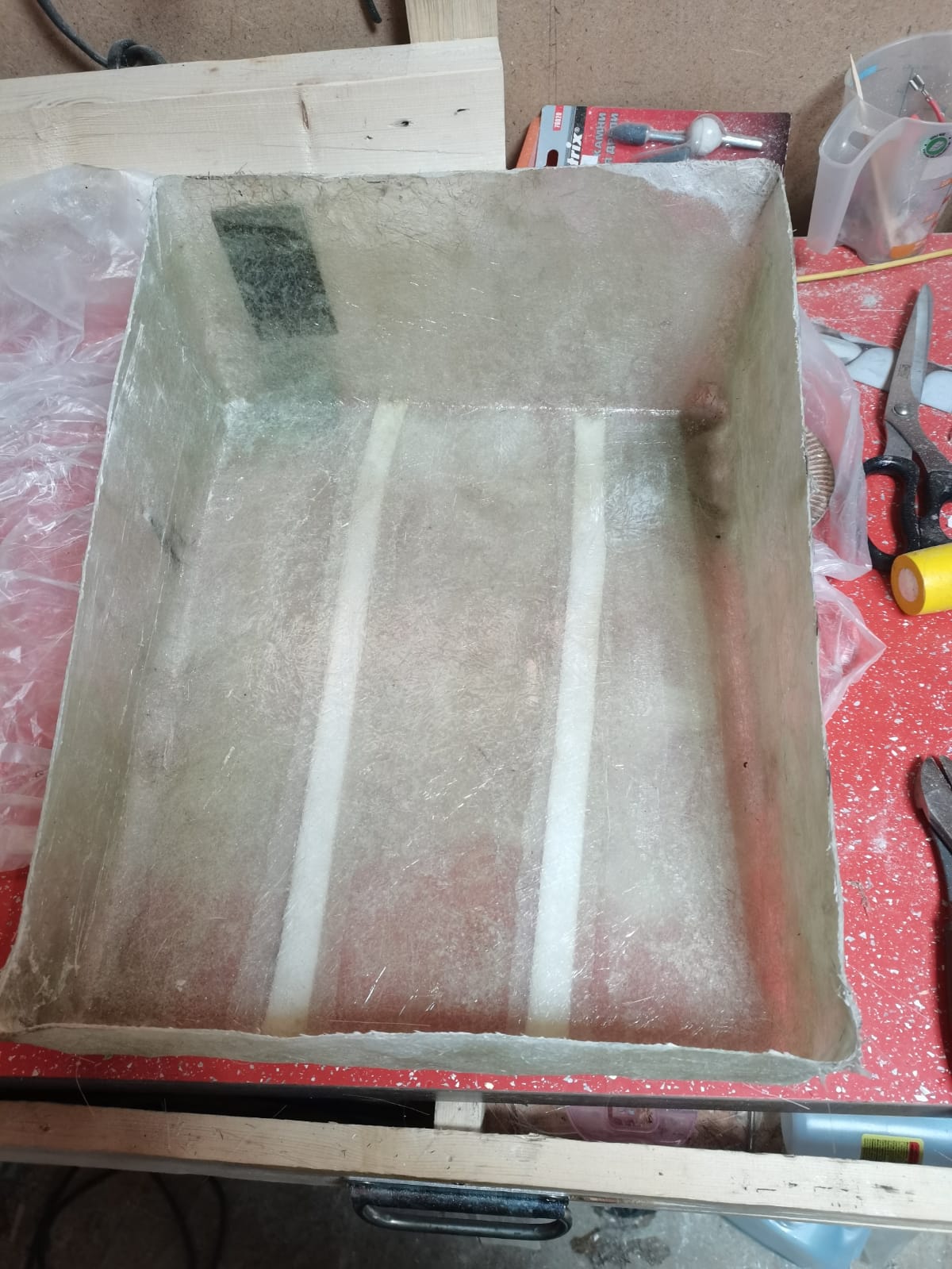 Посмотреть вложение 506868 Затем дно покрыл фторым слоем с формированием рёбер жёсткости. Для отого использовал пенополиэтиленовый утеплитель в виде колбасы диаметром мм16-20, разрезал пополам, приложил к внешней стороне дна и закатал вторым слоем ровинга. Дно получилось жёстким..