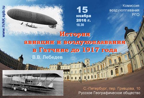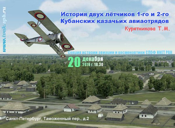 И напоминаем Вам, что мы также ждём Вас во вторник 20 декабря 2016 г. к 18.30 на заседание Секции истории авиации и космонавтики СПбФ ИИЕТ РАН (С.-Петербург, Таможенный пер., д.2, Зал заседаний), где Татьяна Михайловна Курятникова поведует нам о военных лётчиках Кубанских казачьих авиационных отрядов. Информацию об этом мероприятии вы найдёте здесь / http://ivak.spb.ru/about-ivak/activity/zasedanie-sekcii-20-dekabrya-2016-g.html