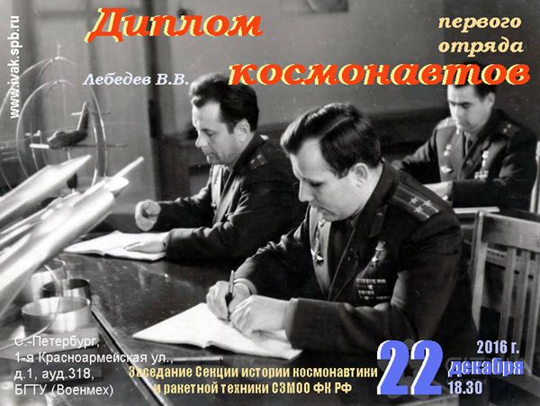 Поэтому приглашаю Вас в четверг, 22 декабря 2016 г., в Балтийский государственный технический университет (Военмех) им. Д.Ф. Устинова (СПб., 1-я Красноармейская ул., д.1), где в ауд.318 вашему вниманию будет представлен доклад «Диплом космонавтов (первого отряда)» вашего покорного слуги, который мы посвящаем 55-й годовщине полёта Ю.А. Гагарина в космос и 75-летию кафедры А1 («Ракетостроение») Военмеха, моей Alma-mater, которое мы отметили 18 ноября 2016 г.