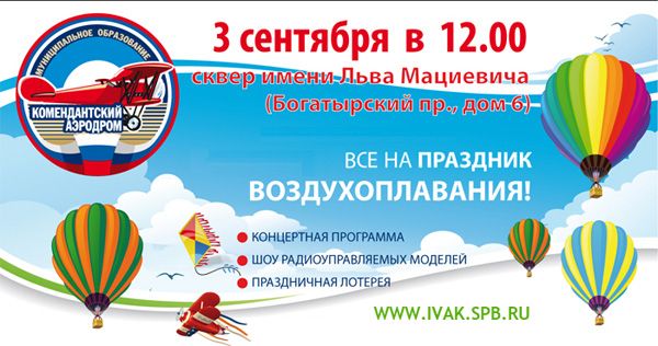 Не пропустите этот уникальный случай и будьте вместе с нами 3-го сентября в сквере имени Льва Мациевича (Богатырский пр., д.6). Начало праздника воздухоплавания в 12.00.