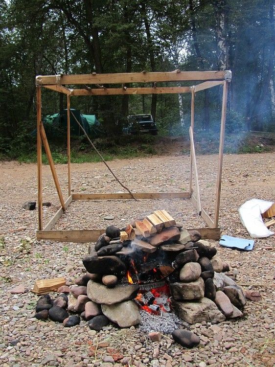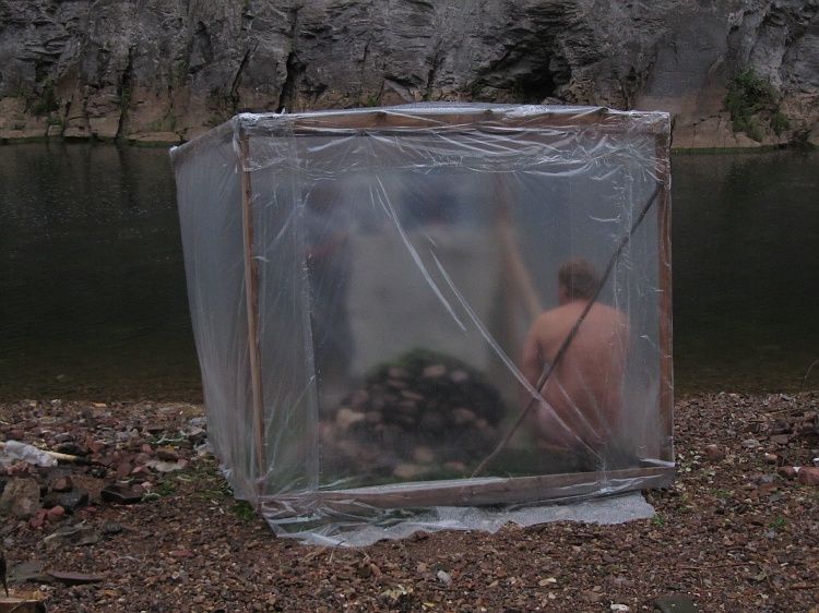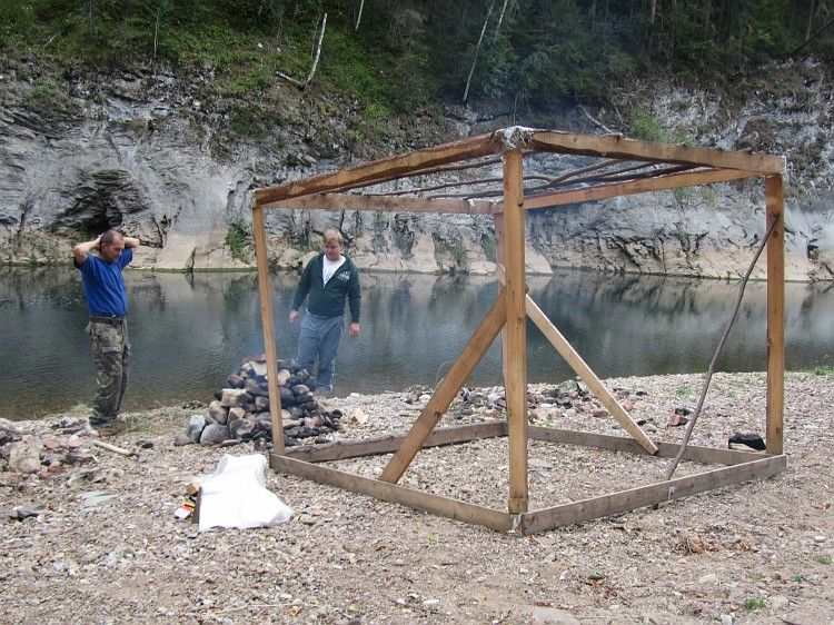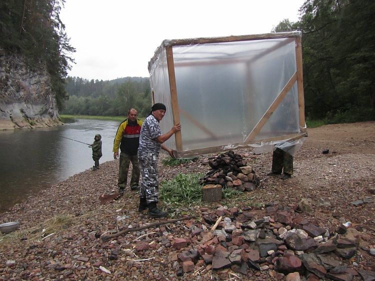 Сначала внутри кучи камней пару часов жгут костер. Затем его тушат и накрывают домиком с ребрами из досок, обтянутым полиэтиленом.