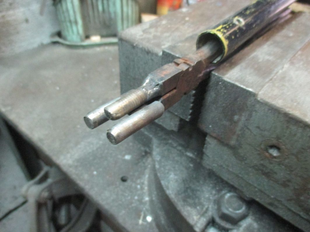 С помощью вот такого нехитрого приспособления. Есть ещё одно с двумя пластинами вместо прутков, для выпрямления уголка, ели перегнул.