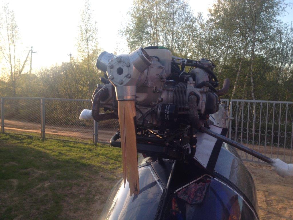 После установки двигателя и пропеллера, заливки всех жидкостей, удаления воздушных пробок и т.п. я решил провести опробование и попытался запустить мотор. К сожалению, я допустил одну маленькую, но весьма важную ошибку - не пришвартовал самолет к чему-нибудь, понадеявшись на колодки и тормоза. Двигатель завелся не сразу, но когда завелся (видимо в результате разных, не всегда осознанных манипуляций с газом, обогатителями и всякими ухищрениями типа аэрозоли "быстрый пуск") - несанкционированно вышел на взлетный режим.