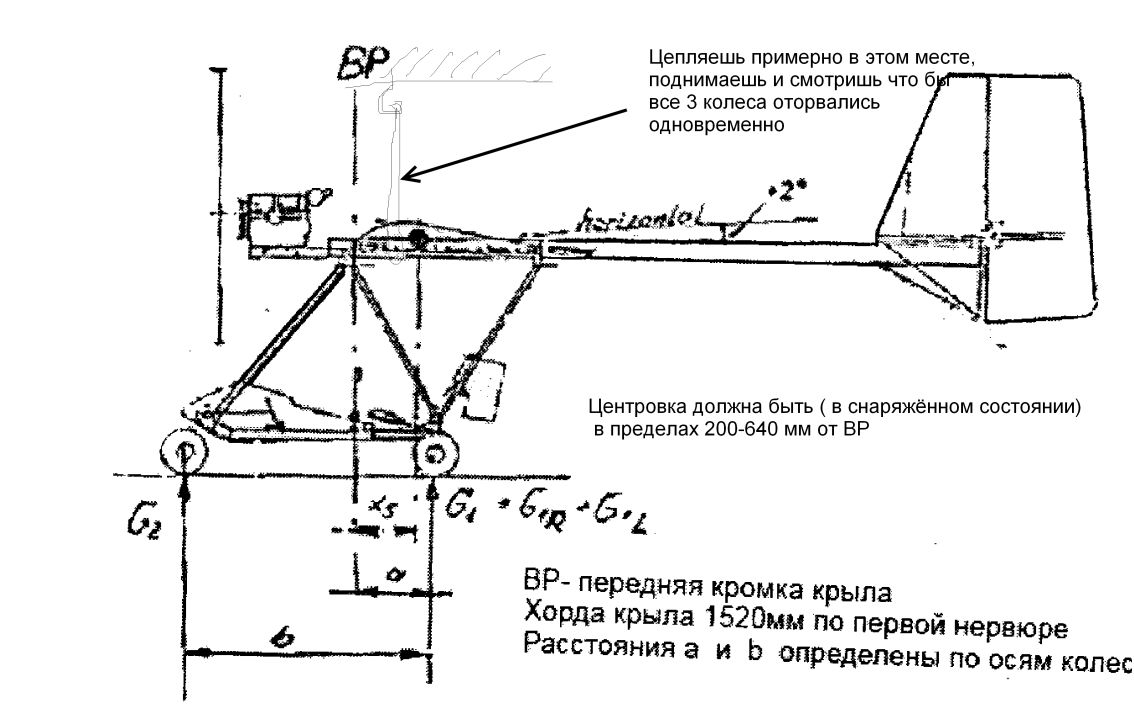 Ещё можно так: Отметь от переднего лонжерона на продольной трубе расстояние 380 мм. что составляет 25% САХ. Подвесь самолёт за это место. Загрузи его 2-мя лётчиками-испытателями, залей полный бак бензина и поднимай. Если все колёса сразу отрываются всё ок. Если сначала переднее колесо то хвост тяжеловат, если основные то нос.Ну и в зависимости от того что тяжелее подбирай какой вес и куда повесить. Может акб передвинуть стоит(если есть) может ещё что . Ну как то так.