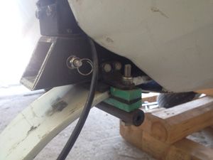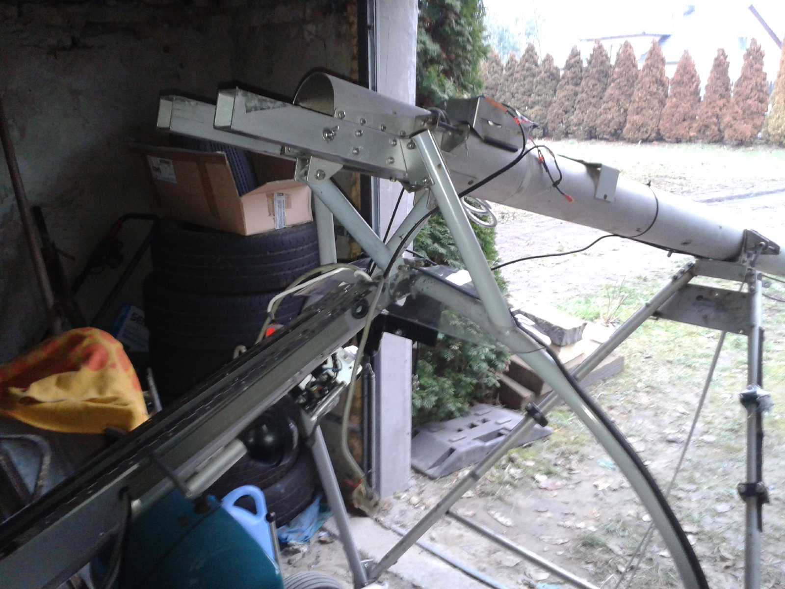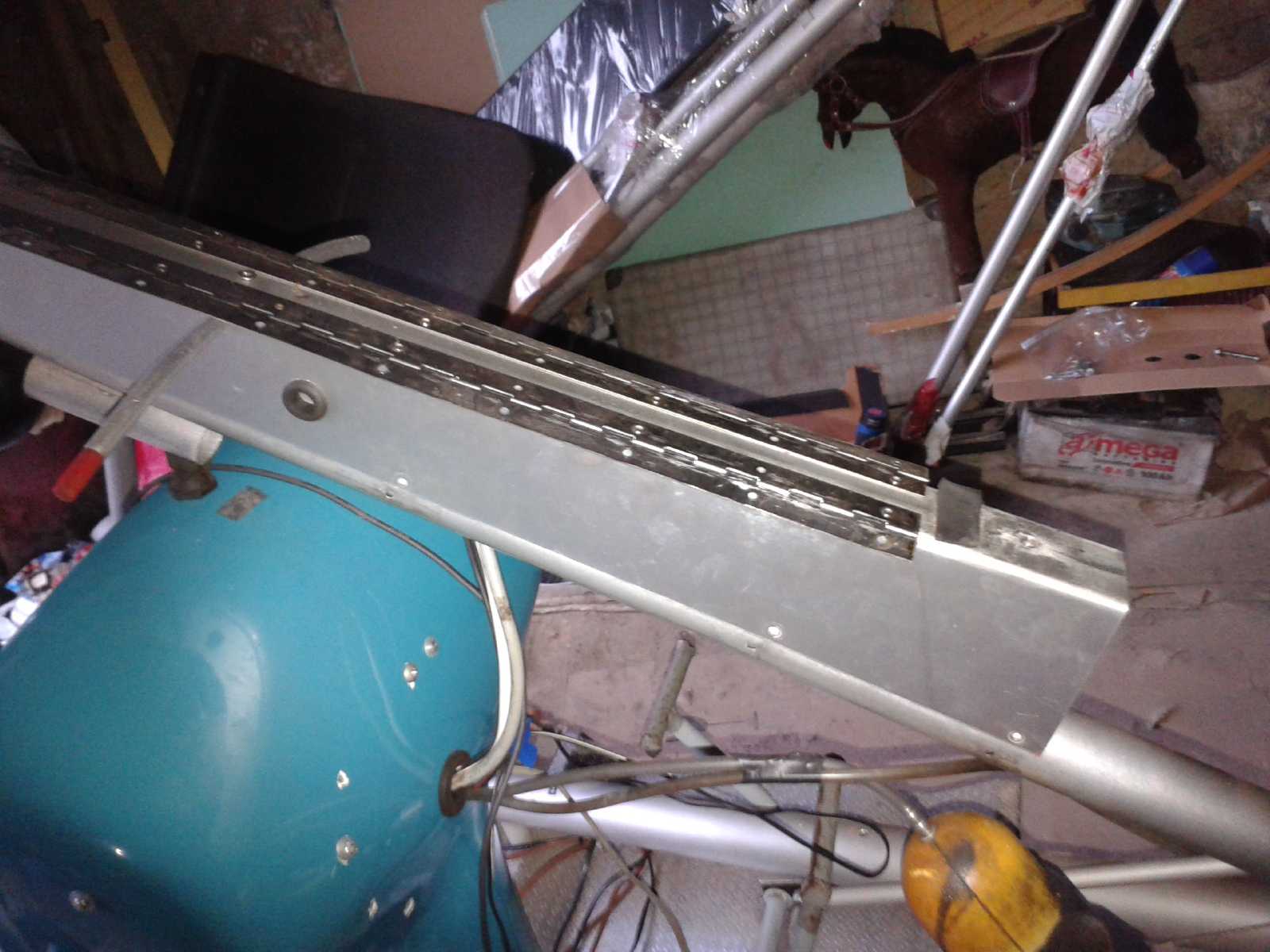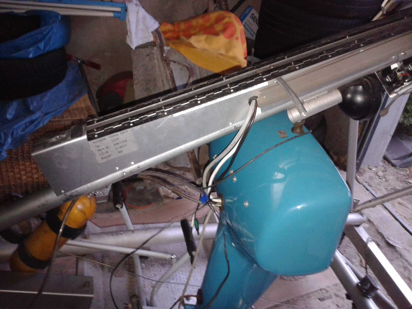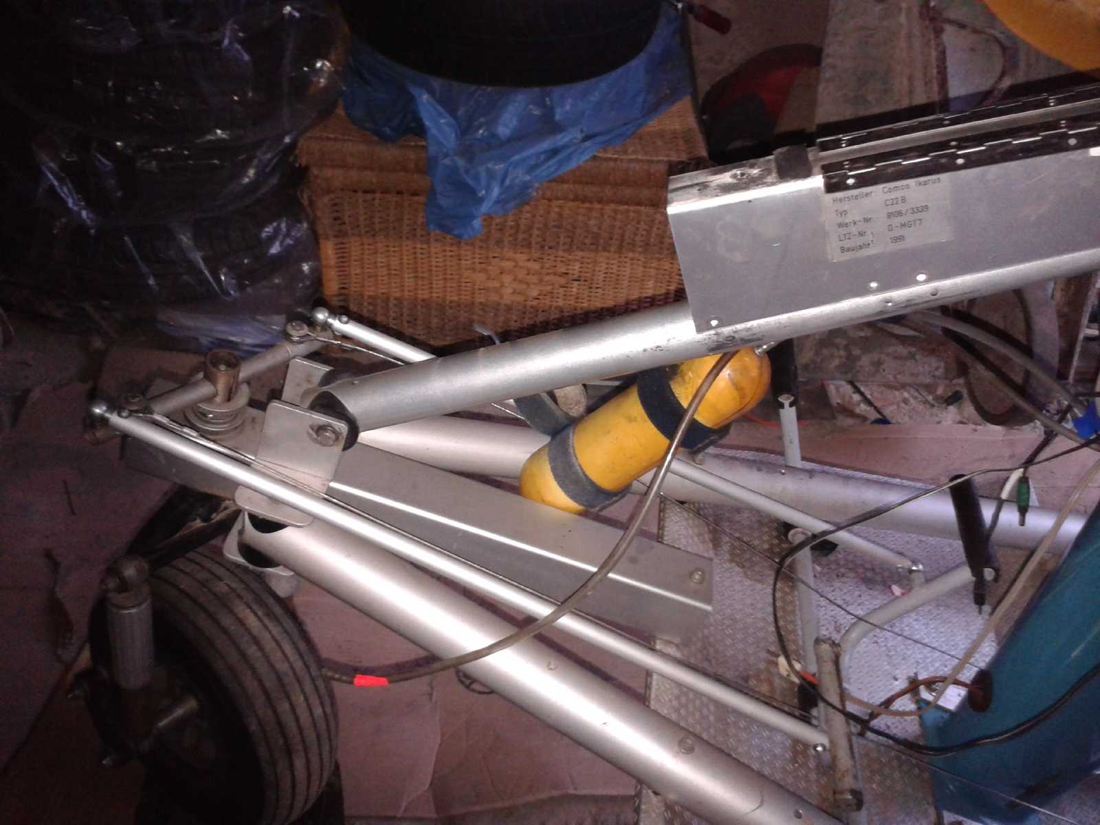 А сколько их сейчас появилось? Что бы статистику собрать. Для СЛА с носовой опорой, задолго до Икарусов  🙂 сделал лестницу-водило. К сожалению, кроме одной фотографии, ничего не сохранилось. Но если посмотреть на фото, в верхней части лестницы, плоский захват на килевую трубу. Там же, струбцина, позволяющая обхватить носовое колесо за ось. С одной стороны этого захвата-вилки, приварен болт с конусом, а с другой стороны - гайка, в которой такой же болт с конусом, но он докручивается до упора с осью переднего колеса. Болт (винт) с откидной головкой. Ступеньки лестницы на тросиках раскрываются, а когда используется как водило, складываются вдоль трубы. Основная труба, дюраль ф30х2,5. Другой не было.