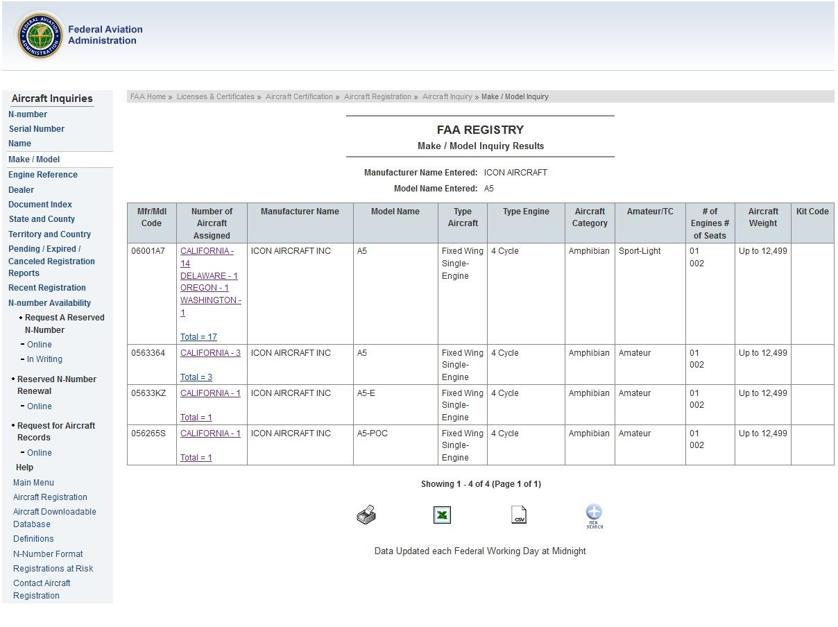 Все это можно посмотреть здесь http://registry.faa.gov/aircraftinquiry/AcftRef_Results.aspx?Mfrtxt=ICON+AIRCRAFT&Modeltxt=A5&PageNo=1