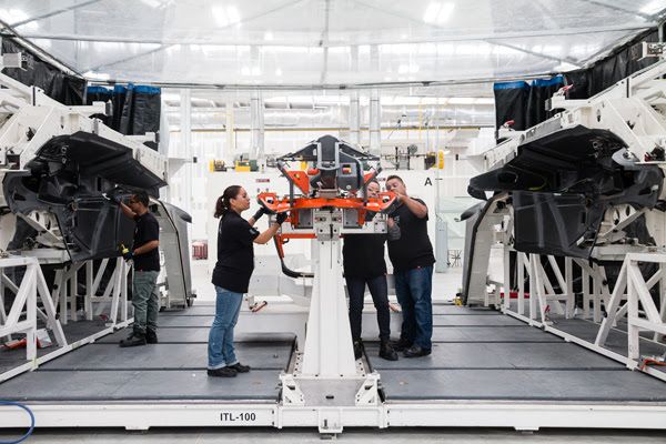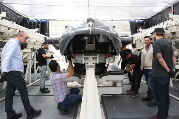 ICON technicians prepare to remove the newly joined fuselage halves from the tool in which it was bonded.
