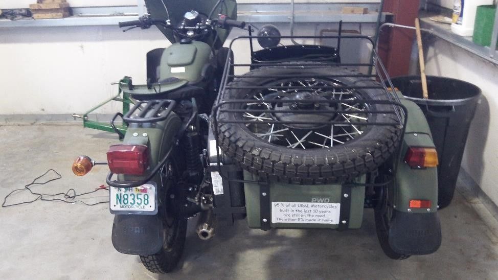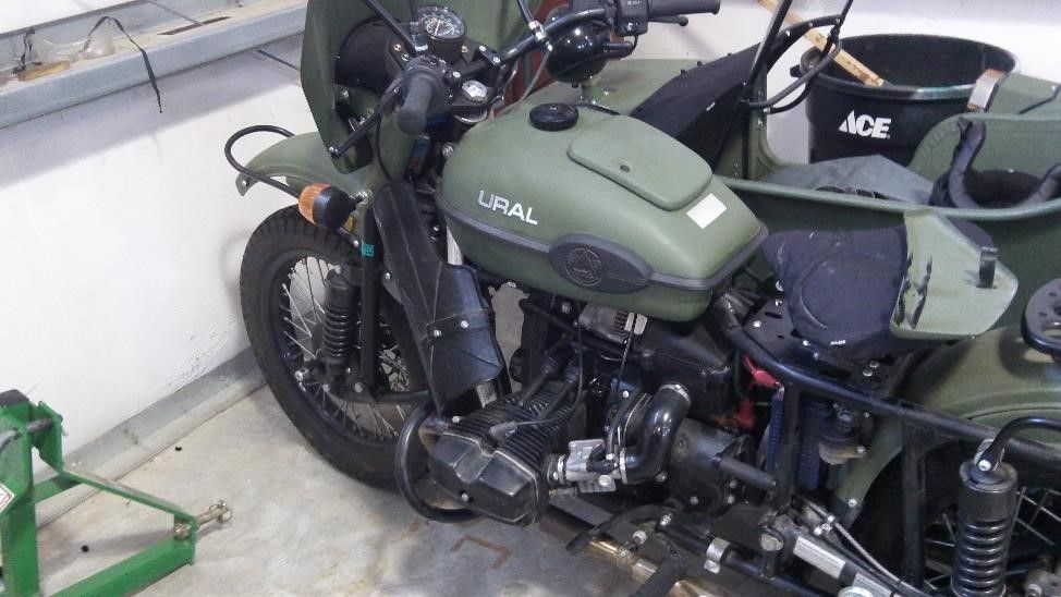 Прикольно еще то что внутри ангара стоит себе замечательный всем нам известный мотоцикл Урал С Нью Хемпширскими Регистрационными  Номерами