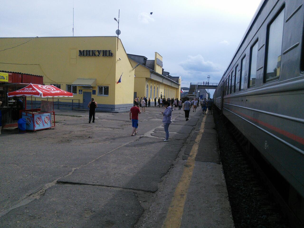 "Уважаемые пассажиры,  наш поезд прибывает на станцию Микунь (до Сыктывкара 90км), время отправления 15 40, будьте осторожны"