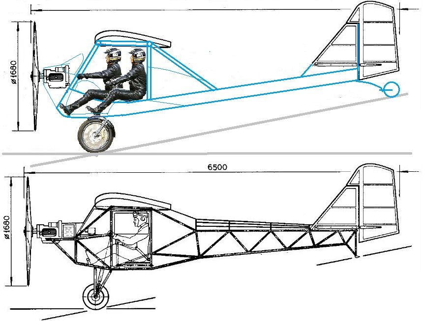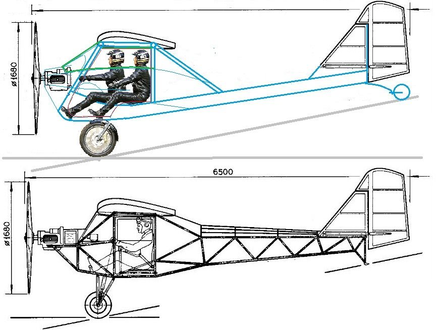 Нет Андрей,не раскинул.Просто хотелось верить,что трубчатый хвост окажется легче фермы с обшивкой.Но это ерунда.Лапшин прав,надо прорабатывать подходящий для себя вариант.Так что фюзеляж будет фермой,мне с ней проще.И мотор будет смещён вперёд,как и на Фролове,просто пилотское место станет пассажирским,а пилот в ЦТ сядет.Кстати,Фролова "привёл к нормальному бою")))Увязал три проекции,длина его 6м,а не 6,5 как у Кондратьева.Хорда 1,2м.Может,и крыло однолонжеронное будет,чтоб от труб не зависить...Пока прорисовываю)