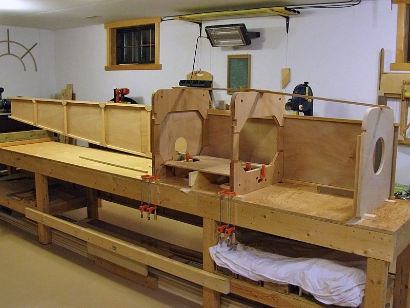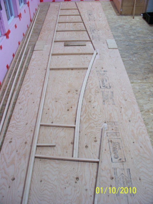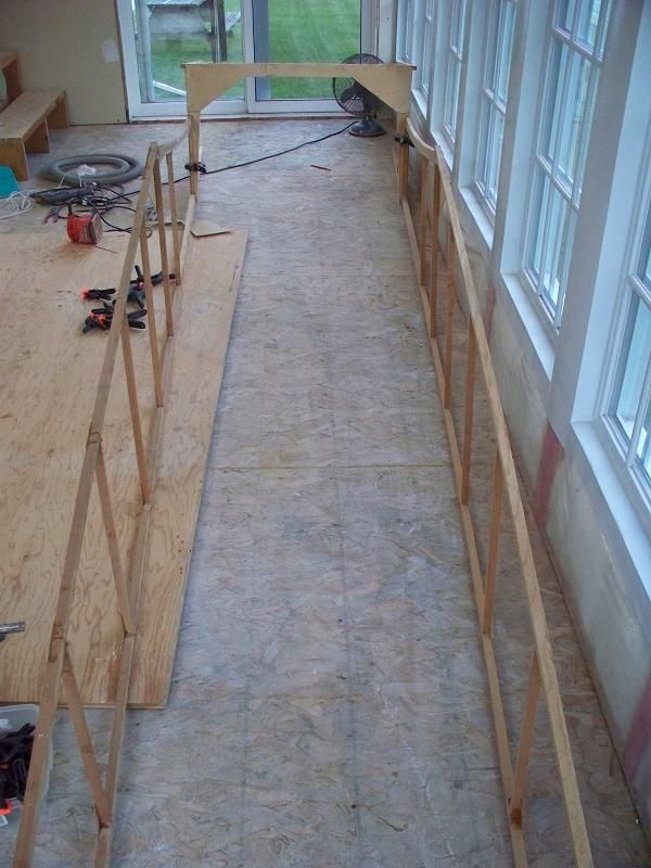 2)Фото. Собирается 2 рамы на плоском стапеле. Ставятся вертикально, изгибаются по теоретическому контуру,соединяются поперечинами. Фанерную обшивку лучше клеить когда они плоские или после изгиба?
