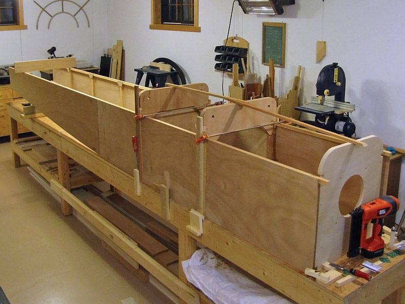 Тролль,привет. Ты про какую фанеру спросил ,про боковую или нижнюю?Я ,на пример,боковую обшивку пришил сразу на стапеле,подготовил шпангоуты,потом на размеченом контуре-вид сверху- установил шпангоуты ,а к ним,потом,собрал панели,(всего шпангоутов было пять-три в кабине пилота и два киль)собирал сначало пол,в смысле низ.