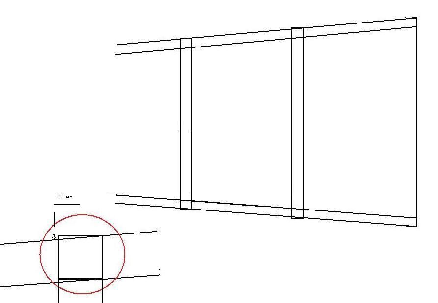 1)      Рис. вид сверху.Собираются шпангоуты на плоском стапеле. При прокладке лонжеронов, так как есть сужение  фюзеляжа, получается что надо снимать малку с шпангоутов(у меня в частности 1.1 мм по катету). А так как фанерная обшивка предполагается работающей, то нужна высокая точность  подгонки