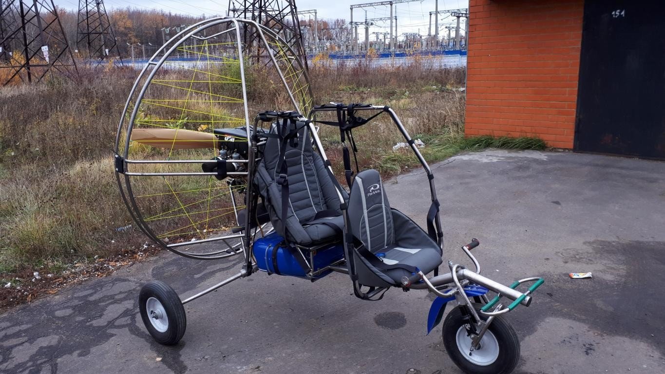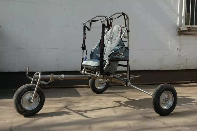 эффективная конструкция шасси ( подвески ), для аппарата, имеющего массу порядка 200 кг. будет составлять 7-10% ( включая вес колес ). Эффективность поглощения энергии от неровностей посредством амортизаторов, зависит от соотношения подрессоренной ( "колясочка" с пассажиром, крылом мотором и топливом ) и не подрессоренной ( колеса, рычаги подвески и корпус амортизатора ) масс. В этом смысле, очень выгодно, амортизатор расположить как можно ближе к точке соприкосновения с грунтом. Пневматик низкого давления, относительно большого диаметра - идеальное решение. Его соотношение к массе аппарата будет в 2-3 раза выше по эффективности энергопоглощения.
