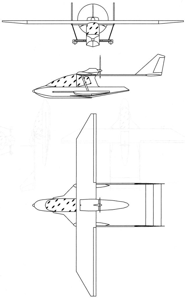 Вылаживаю картинку и коротко: размах крыла-10,09м; длина самолета-7,4м; высота-2,4м; площадь крыла-10м2;удельная нагрузка на крыло-40 кг/м2; взл вес-375кг; одноместный, двигатель rotax-912; хорда-1,1м;однолонжеронное крыло-дюралевое, лодка сварная-АМг5; диаметр винта-1,71м