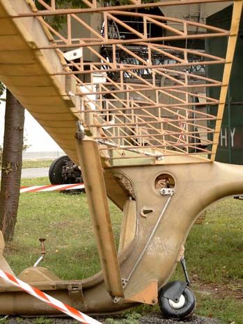 Интересное и простое решение воздушного тормоза применялось на учебном планере PW-2 Gapa. На крыле полностью отсутствует механизация, только плоский элерон подвешен к задней кромке на конце крыла. Роль интерцептора выполняет обтекатель трубчатого подкоса. Обтекатель имеет возможность поворачиваться на трубе и отклоняется на 90 град (задней кромкой к верху), при посадке с помощью рукоятки. Тем самым создается значительное сопротивление, и турбулентный поток от подкосов не попадает на оперение.