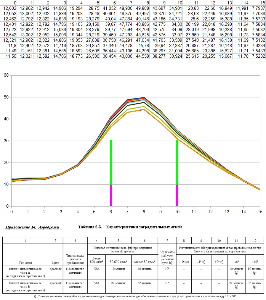 Цифры - данные замеров по градусам вертикали. Верхний ряд - угол.