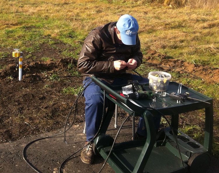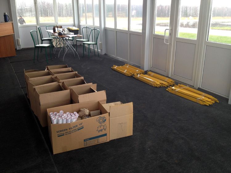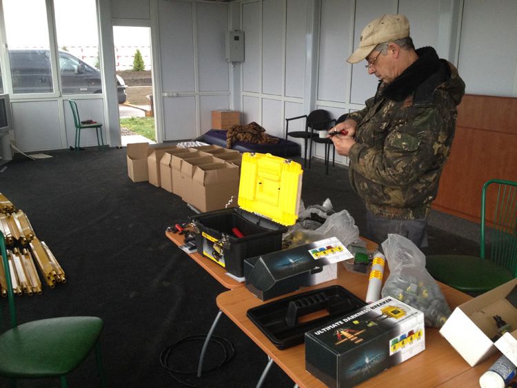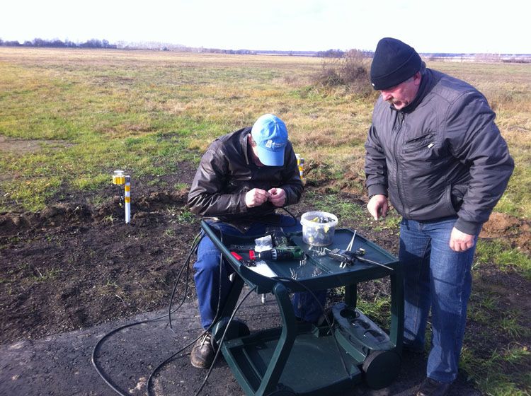 8 ноября выехал с полным комплектом оборудования. Погода была откровенно не солнечная. К полудню был у Олега. Быстро перекусив приступили к монтажу. Как на зло пошел противный холодный дождь с ветром. Павильон Челавиа ещё раз сослужил добрую службу. В него выгрузили всё оборудование и в нём же начали собирать железки. Готовое железо выносили и быстро ставили в поле. К обеду поставили и подключили шкафы управления.