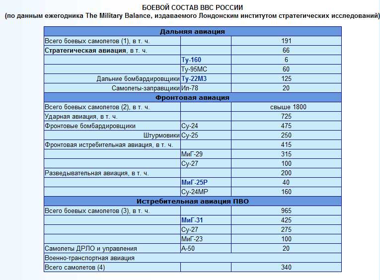 Из 1800 боевых самолётов (ЕЩЕ СОВЕТСКОГО ПРОИЗВОДСТВА) больше 1200 прикованы к земле и нуждаются в капитальном или регламентном ремонте, но для этого просто нет денег или запчастей. Специалисты откровенно говорят, что часть из этих машин восстановить уже просто невозможно, так как они стоят больше 10 лет и почти полностью разукомплектованы. В большинстве авиационных полков из 36 положенных по штату самолётов в небо способны подняться 8-10 машин, а в некоторых полках количество исправных самолётов упало до 4-6 штук. ВВС уже не способны массово воспроизводить подготовленных боевых лётчиков Их просто некому и не на чем обучать. Сегодня в России профессия лётчика является попросту вымирающей. Количество военных училищ за 15 лет сократилось вдвое, а численность выпускаемых лётчиков – в 3 раза.