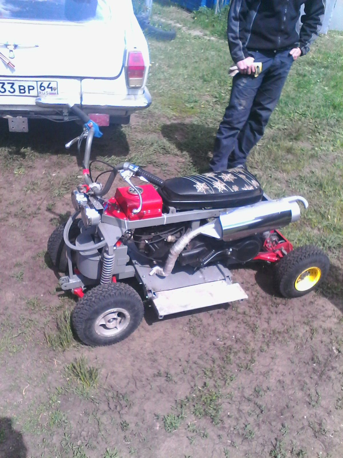 125 кубов, 9 лошадок, центробежное сцепление, две передачи - вперед и назад. Можно к нему присобачить редуктор с дифференциалом от грузового мотороллера Муравей, тоже есть в наличии!
