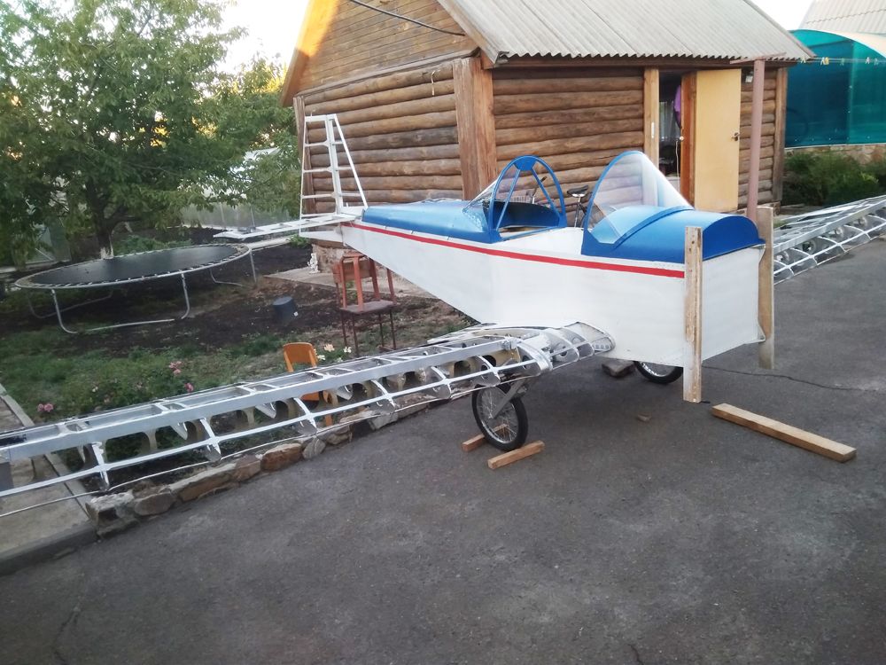 Самолет будет примерно как на фото ниже. Только на этом я не угадал с центровкой ( нужно было центр тяжести пилота разместить на 25 % хорды крыла) и придётся ставить двигатель весом 40-50 кг, мотораму делать длиной 1 метр. То что на фото весит 69 кг. Обшивка будет сотовый поликарбонат 4 мм (добавиться еще 7-8 кг). В 115 кг не попадаю, зимой думаю рассчитать новый самолет, в котором пилота посадить в ЦТ (в моем случае прямо на лонжерон крыла).
