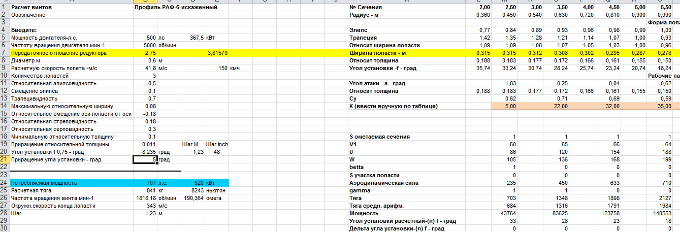 Привожу скрин одной таблички- что в экран влазит. Там немного видно рабочие углы атаки по сечениям...