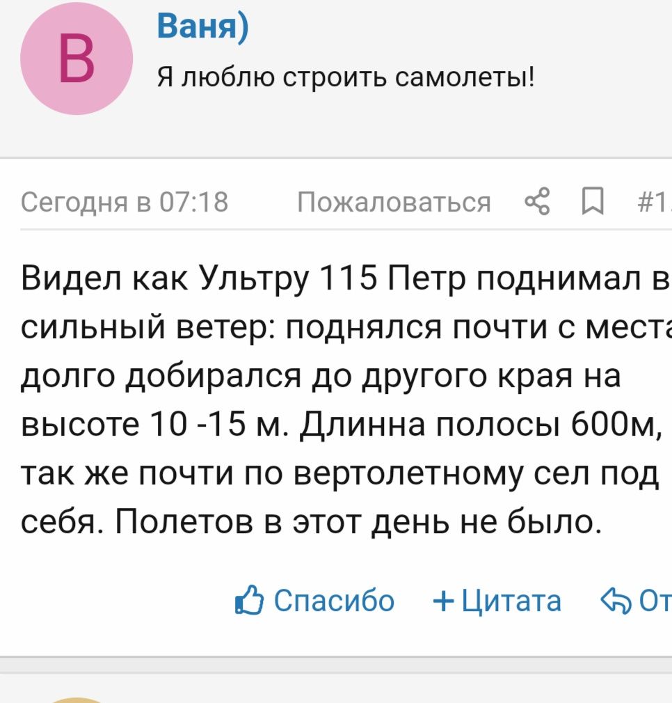 Не совсем так, с Ультрой по крайней мере, летал и в ветер, иногда в такой сильный , что другие наши ,более тяжелые самолеты и носа из ангаров не высовывали, именно такой случай Ваня видимо и описал.Самолетам 115 кг нужны идеальные погодные условия