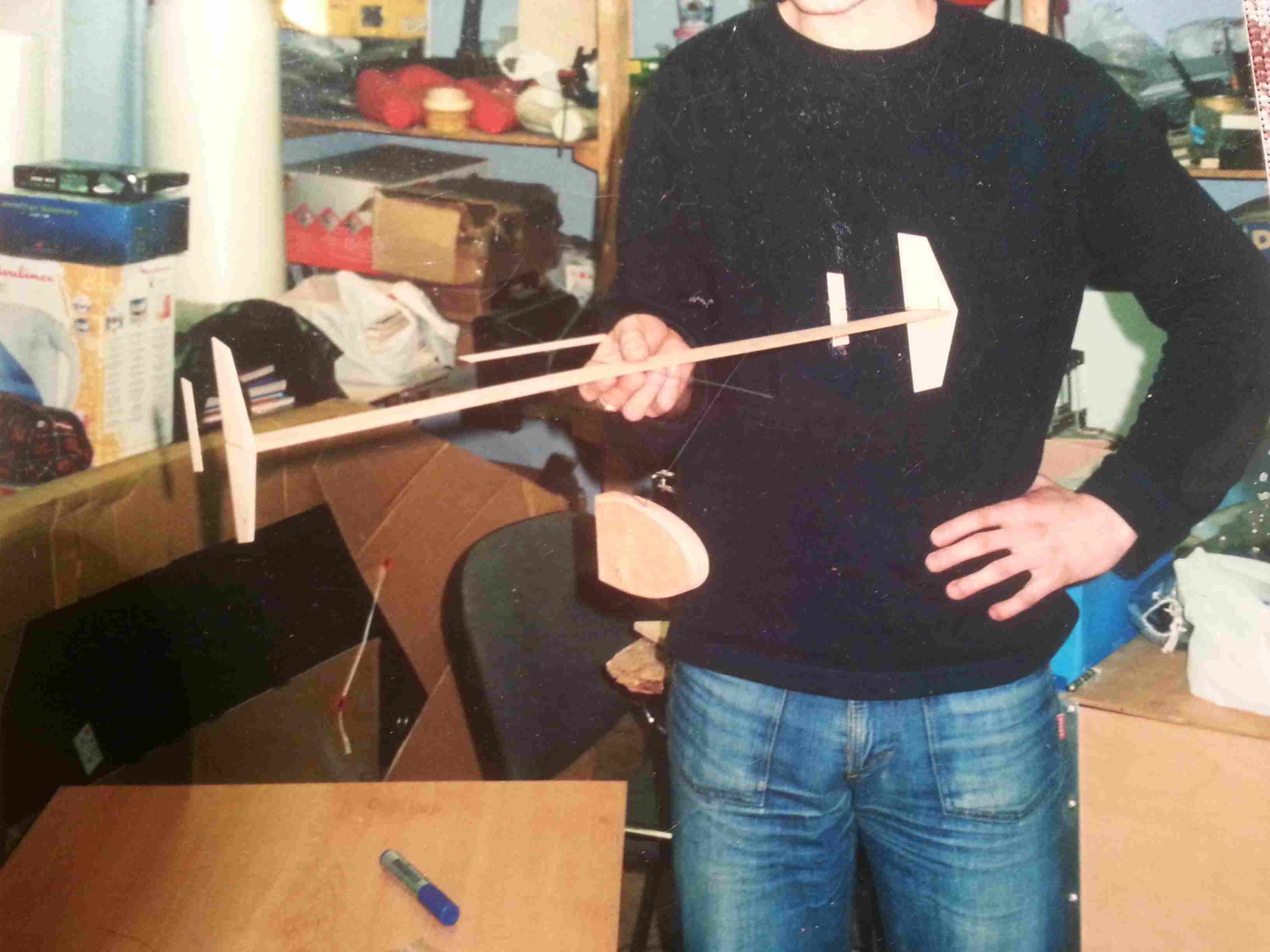 Вот еще из старого- самолет качеля. Без килей, с флюгерными шайбами, отклонялись только наружу. Моделька летала неплохо. Для диплома делалась. Для диплома пойдёт.