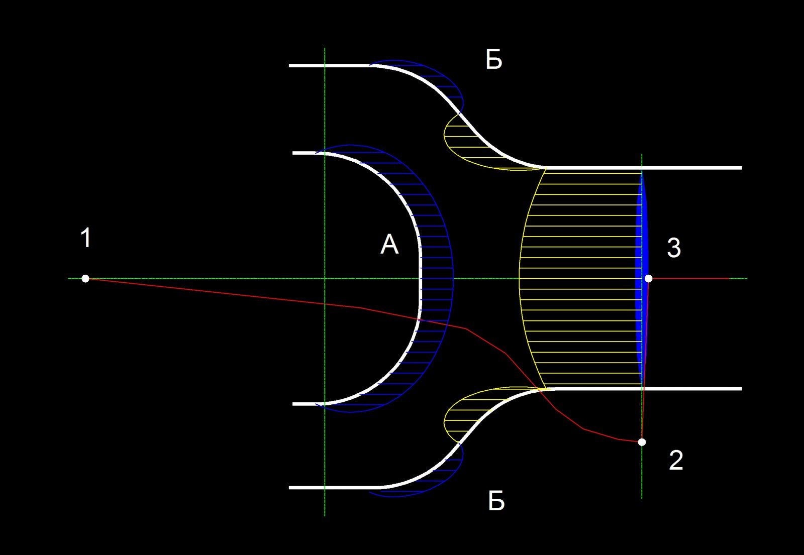 Синими полосками отмечены области ( А и Б ) с давлением, создающим силу, направленную против движения ЛА. Эти силы создают дополнительное сопротивление. Это так же, проекции распределенного полного давления.