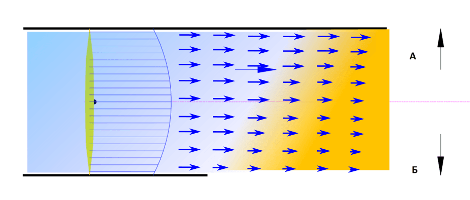 Если рассмотреть слой воздуха продвигающийся вдоль оси патрубка, то первой начнёт затормаживаться нижняя часть этого слоя. Возмущение от этого торможения передаётся "вверх" (по картинке) со скоростью звука и достигает верхней стенки патрубка на некотором удалении от нижнего среза (в горизонтальном измерении). При повседневных скоростях потока и достаточно остром угле среза, картинка распределения давлений будет приблизительно такой:Посмотреть вложение 527766