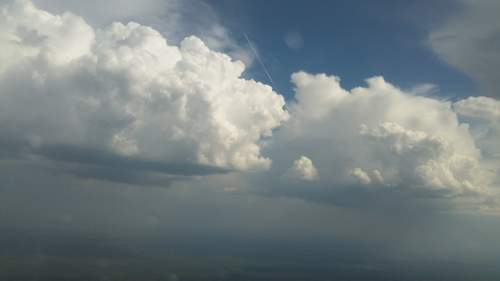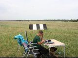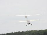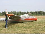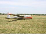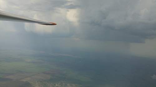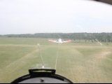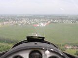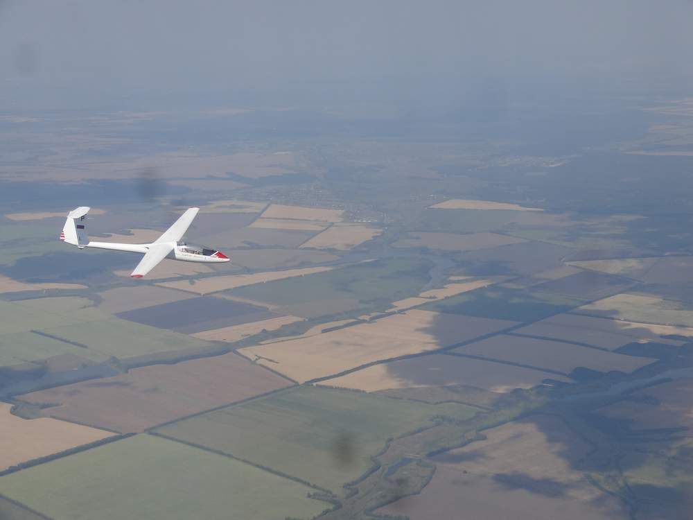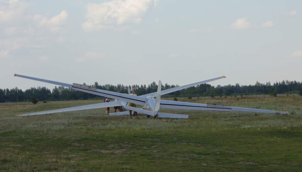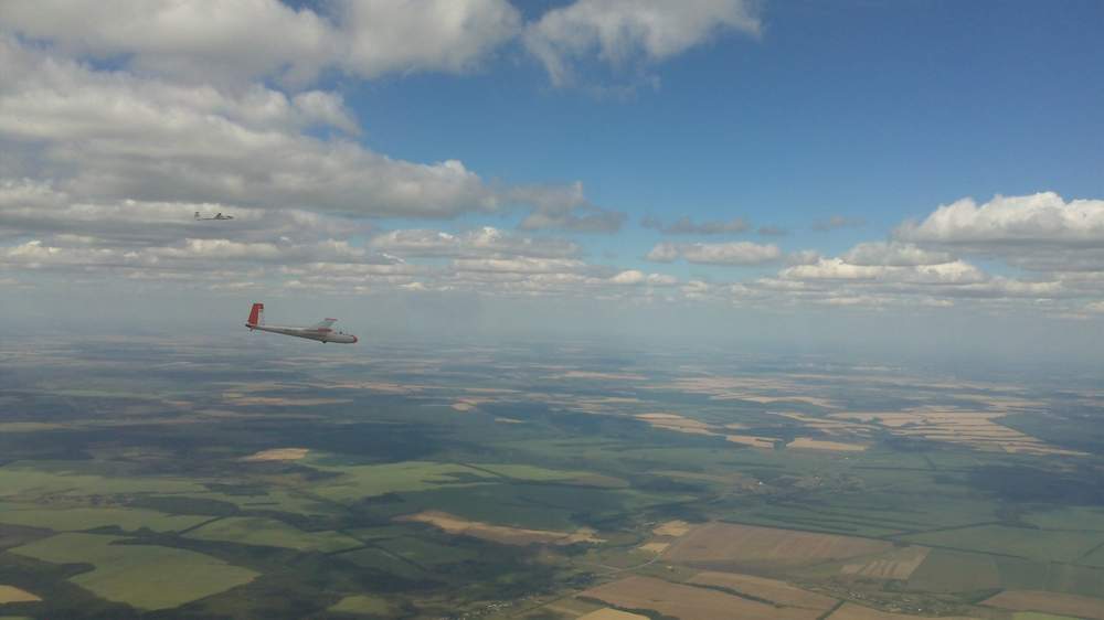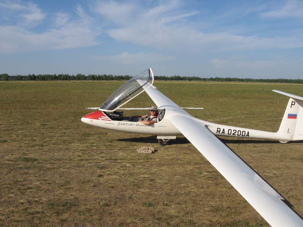 Начну сначала. "14 07, к взлету на парение готова"... День был просто замечательный. Потоки плюс четыре-пять, когда тебя реально тянет вверх, и хочется еще, еще, еще выше, но дальше, увы, облако, а потому ручку от себя и к следующему. А по дороге к намеченному облаку вдруг стрелка прыгает вверх и мощный поток снова поднимает до 2300... И так бы летать и летать, но... на сегодня намечено парение с площадкой. Поэтому выбираем площадку и снижаемся. Снизиться не могли мы долго. Нас только поднимало. Пришлось выпускать интерцепторы, и только после этого планер нехотя начал снижаться. С тысячи девятисот. Осмотр площадки, несколько "кругов почета" вокруг неё... Доклад и заход на посадку. Касание, остановка, снова доклад. Все. Можно вылазить и осматривать. Ужасно неуютно. Планерок так сиротливо выглядит в этом поле... Вот и самолет прилетел. Взлетаем... Первый взлет на коротком фале. Первая мысль "блииин, а я в самолет не врежусь?!". Тут буксировщик делает несколько разворотов. Планер ему в хвост встать не успевает. Я своими попытками выровнять планер только усиляю разбалтывание. Инструктор уже не выдержал и начинает мне помогать... Еле-еле все-таки выравниваюсь. Ну наконец-то, отцепка. Сажусь. Забываю напрочь про тормоз колеса и свищу куда-то в конец полосы. Да что же это такое!