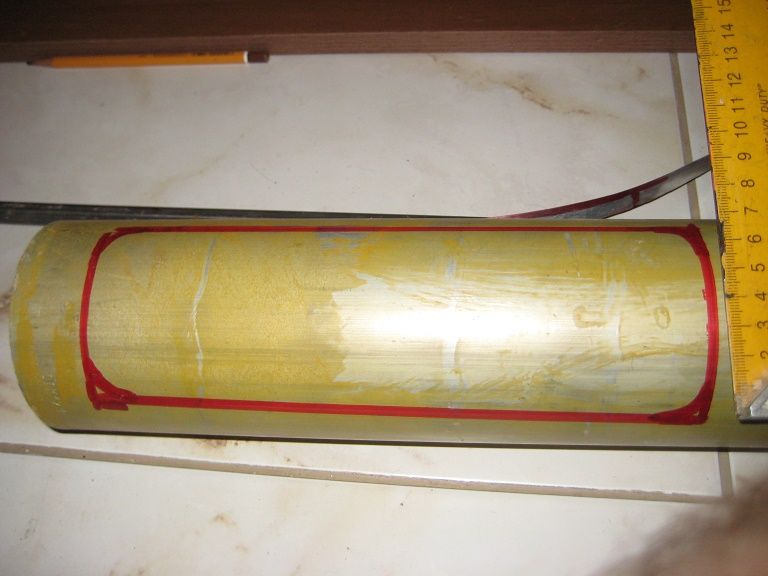 Так, как нарисовано, надо делать на конце лонжерона; по мере приближения к подкосу окна при подобной форме следует уменьшать, а перемычки увеличивать согласно нарастанию изгибающего момента и перерезывающей силы. Цифры проверять за Вас я не стану - я обычно советую, а не выполняю расчетов из альтруистических соображений. Радиусы скругления надо бы увеличить существенно, кромки после вырезов притупить и зашлифовать.Уважаемый Владимир Павлович, в посте №898 Вы подтвердили возможность облегчения лонжерона путём частичного удаления стенок трубы. На фото ниже я изобразил одно из "окон". Такие окна я планирую выполнить по боковым поверхностям лонжерона до места установки подкоса. При длине окружности 282 мм будет иссечено 140(по 70 с каждой стороны), т.е. половина. Ширина образовавшихся нижней и верхней полок лонжерона получается по 70мм, опорные поверхности под нервюрами планирую оставить по 60 мм (кольцо), т. е. в местах установки нервюр окон не будет. По углам иссечённой фигуры будут радиусы 5мм при использовании сверла диам.10мм.