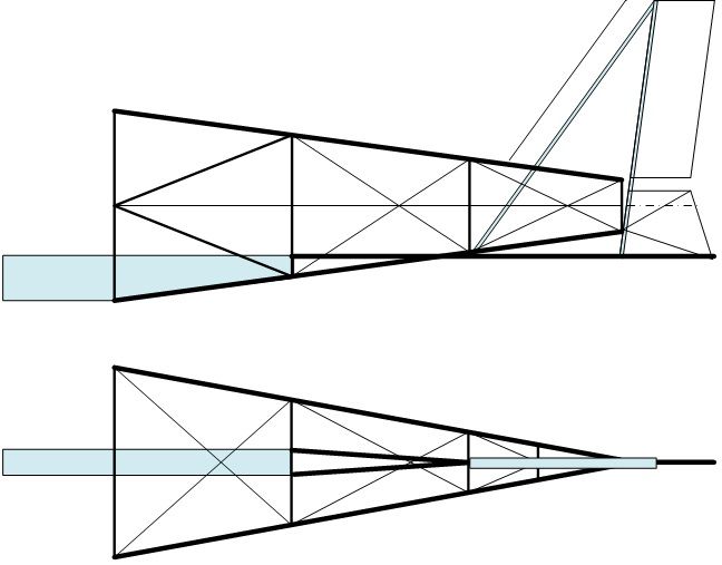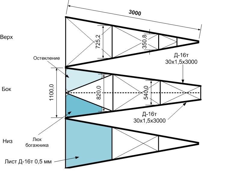 Уважаемый Владимир Павлович, есть ряд вопросов по ферме. Проблема в том, что нет опыта создания ферм из алюминиевых сплавов. Основа четыре трубы Д-16т 30 х 1,5 х 3000 (показал жирными линиями). Остальные детали будут из АД-31. Предположительно квадрат [ch9633] 25 х 25 х 2. По расчалкам тоже вопросы.
