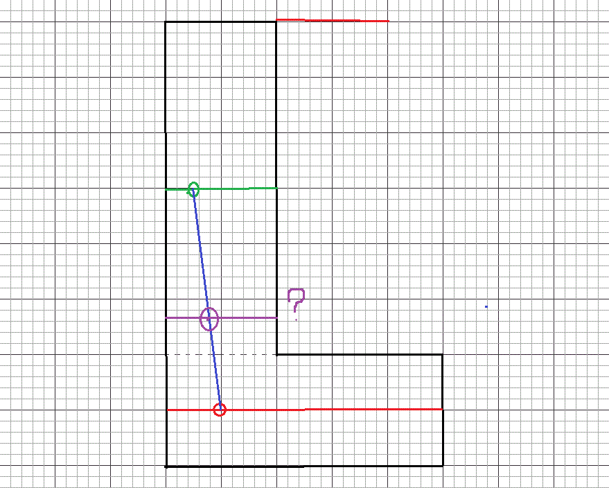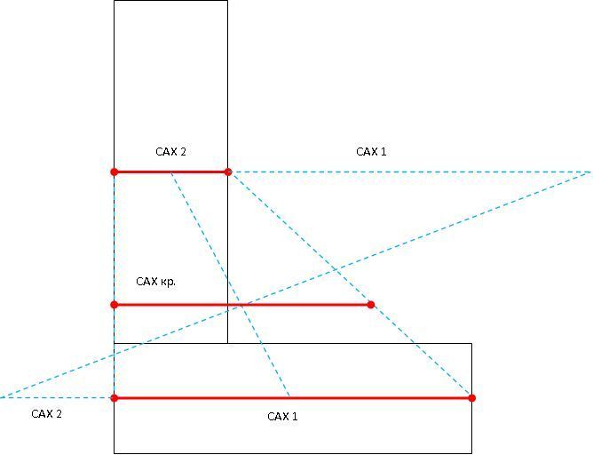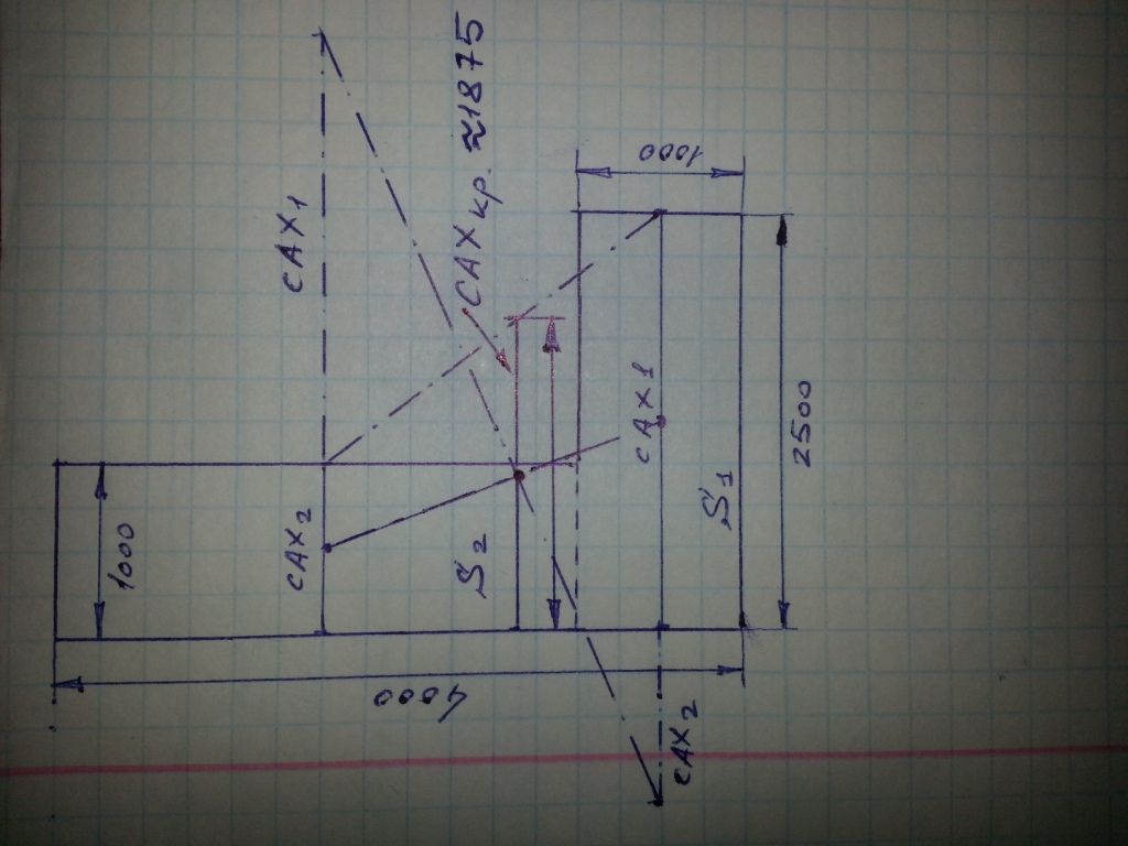 Так? Разбиваю на корневой план и концевой план. Нахожу САХ1 корневого(красный) и САХ2 концевого(зеленый), провожу между ними линию. и делю ее на две части пропорционально площадям (S1=2.5^м2, S2=3м^2)