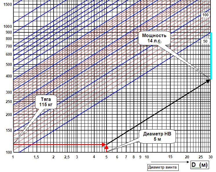 Так вот по диаграмме выходит, что несущий винт с диаметром 5 метров покажет подъемную силу порядка 115 килограмм. Выходит на каждую лошадиную силу приходится 8,21 килограмм подъемной силы.