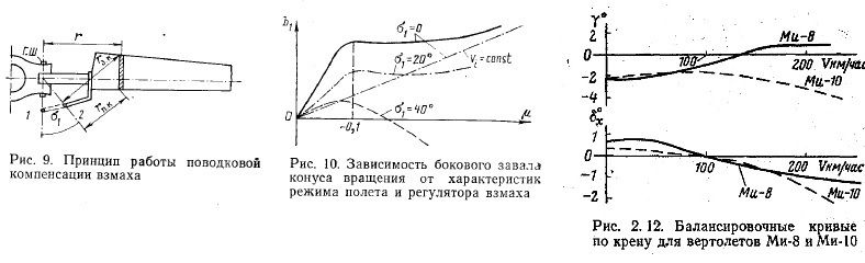 только на маховое движение: то есть меняет углы атаки лопасти только за счет подъема-опускания относительно шарнира поводка точки оси ОШ, в которую попадает перпендикуляр из этого шарнира (и, если этот перпендикуляр попадает в ГШ, то мы и считаем, что компенсация = 0, потому что эта точка перестает подниматься при махах).