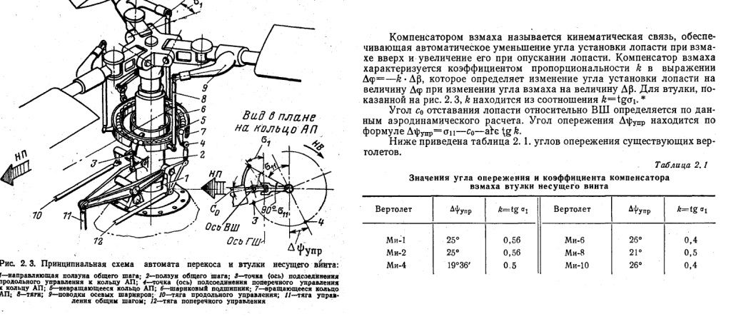 при соосности конуса и вала" отсутствуют махи (во всяком случае 1-го порядка, с периодом в оборот). А компенсатор взмахов (вынос шарнира поводка ОШ наружу от радиуса ГШ) реагирует