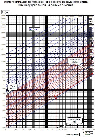 Эта номограмма Б. Н. Юрьева показывает наилучшее соотношение диаметра несущего винта, мощности и тяги на тот момент времени, когда он написал свой труд.