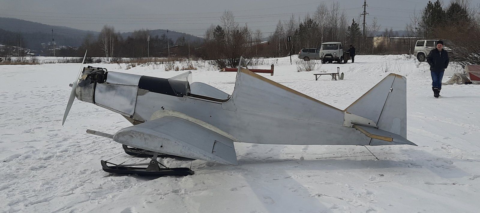 С утра был снег, но отменять мероприятие не стал. Ну для начала скажу, что пластиковые накладки расширители от снегохода себя полностью оправдали. Ушли все проблемы с поворачиваемостью вправо. Трогается с места менее чем в полгаза. Ребра на середине лыж помогают и самолёт на скорости едет на них как на коньках. Снег осел подтаял, подмёрз. Появились заметные ступеньки от ездивших по пруду снегоходов. Но лыжи отрабатывают отлично! Но и хвост стал поднимать на бОльшей скорости. На голых алюминиевых,трение было такое, сто практически вся тяга и уходила на преодоление сопротивления лыж. Просто так сдёрнуть самолёт было нельзя, как ни упирайся. Только втроём. Один за нос, и двое в консоли. Это было прошлый раз. Теперь, беру за винт и спокойно двигаю куда надо, как на колёсах.